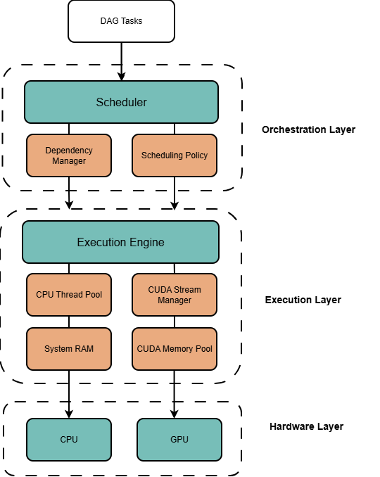 ExecutionEngine: The physical executor; wraps tasks into std::future objects to run within the CPU thread pool or GPU streams.